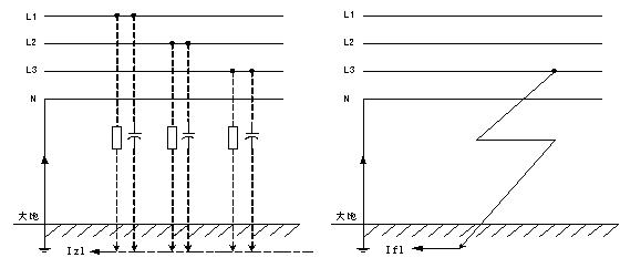 圖1 線路正常時(shí)絕緣電阻及分布電容對(duì)地漏電示意 圖2 線路非正常對(duì)地漏電示意