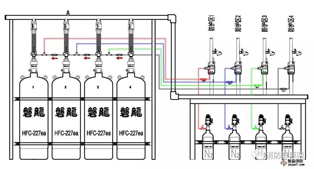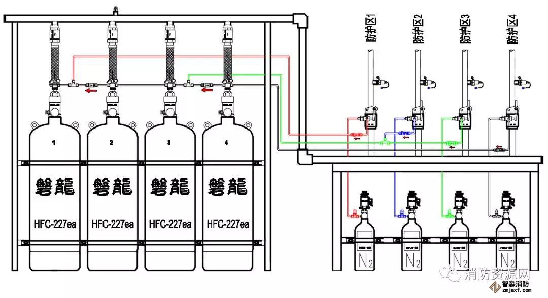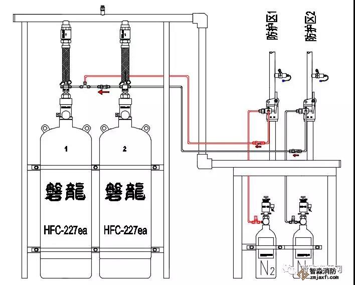 2、以上示例,為方便理解,防護(hù)區(qū)選擇閥依滅火瓶組開啟數(shù)量從右至左逐級變大,實(shí)際應(yīng)用中,排序可能有所不同,可適時調(diào)整。但是,應(yīng)鼓勵設(shè)計施工圖盡量按此原則設(shè)計,以利安裝和使用。