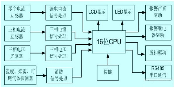 其主要工作原理:把從電流互感器和線性光隔器取得的三相電流、漏電及電壓信號進行調(diào)理后,輸入到單片機的A/D 轉(zhuǎn)換,單片機對其進行采樣后進行分析, 輸出相應(yīng)的顯示及報警信號等。其分析的結(jié)果也可以通過RS485 總線傳送到上位機。