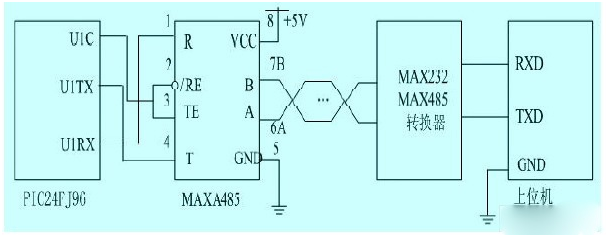因此在一個通訊系統(tǒng)中, 只用一臺上位機作為主機, 其它各臺從機之間不能通信,即使有信息交換也必須通過主機轉(zhuǎn)發(fā)。與上位機通信硬件電路如圖4 所示。