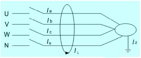 正常情況下,電路中沒有發(fā)生設(shè)備漏電或接地故障時,如圖1 所示,根據(jù)電路原理可知, 三相四線電源的電流相量和等于零,即Ia+Ib+Ic+In=0 ,在電流互感器中產(chǎn)生磁通的矢量和等于零。此時,二次線圈中感應(yīng)電流IL=0,因此線路正常供電。當(dāng)電路中發(fā)生設(shè)備漏電或故障接地時, 例如出現(xiàn)故障漏電電流ZI , 則三相四線電源的電流相量和將不等于零,即Ia+Ib+Ic+In≠0 ,在電流互感器中產(chǎn)生磁通的矢量和也不等于零,此時,二次線圈中有感應(yīng)電流,即剩余電流IL≠0 。